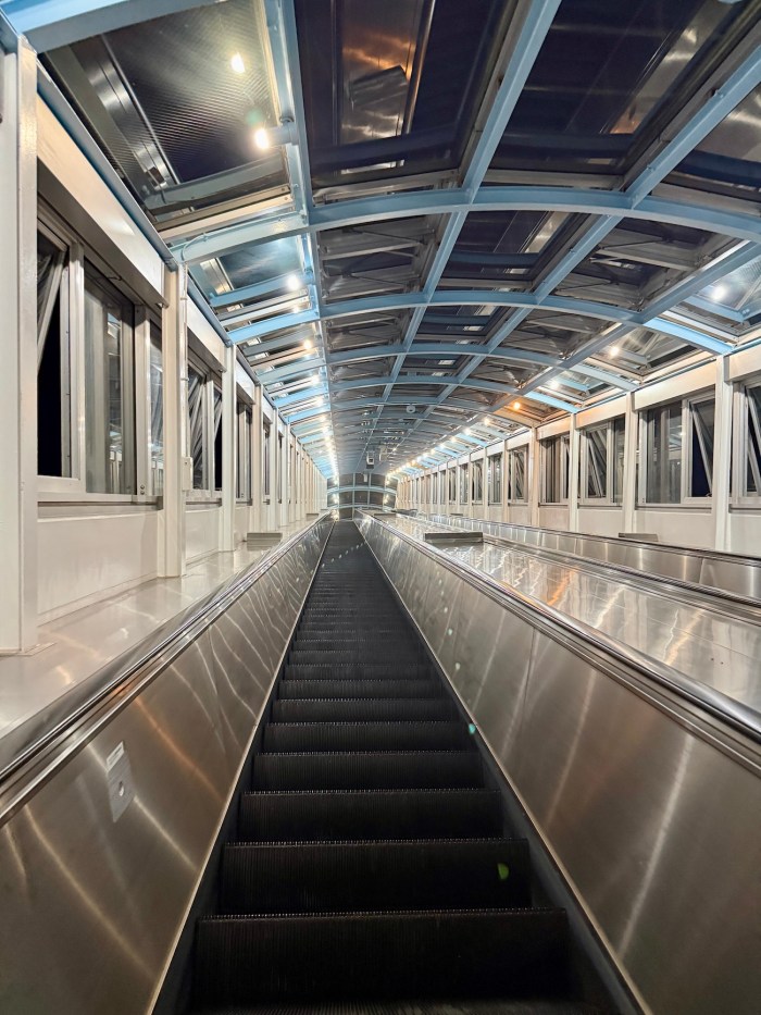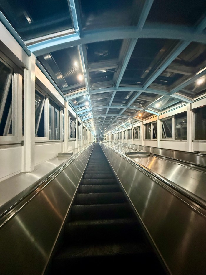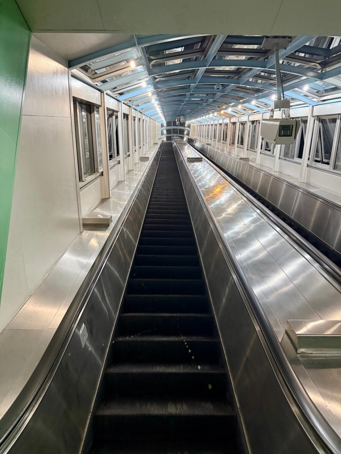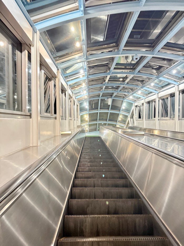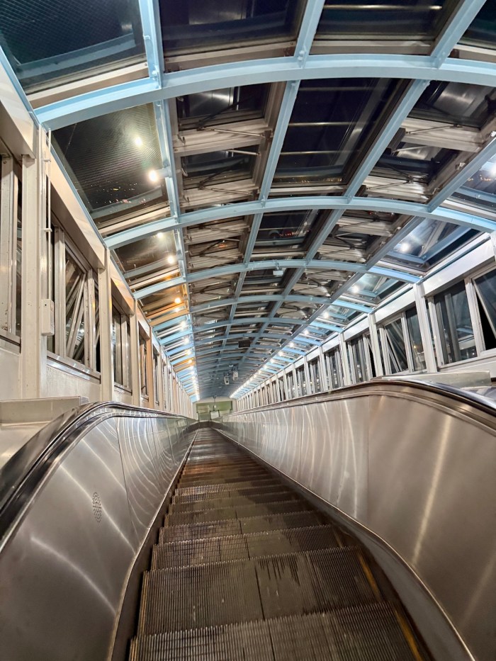 これが宇宙へ続くエスカレーターと言われても信じるレベルの長さ & 高さである。まるでSF映画のような世界。どこへ連れて行かれるのだろうか。