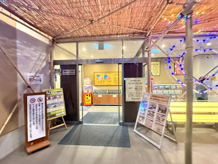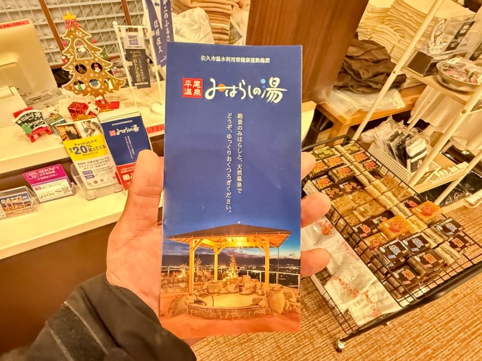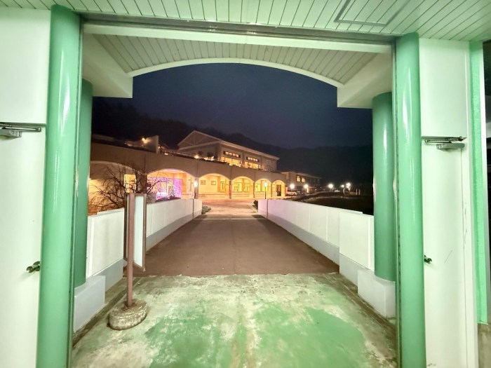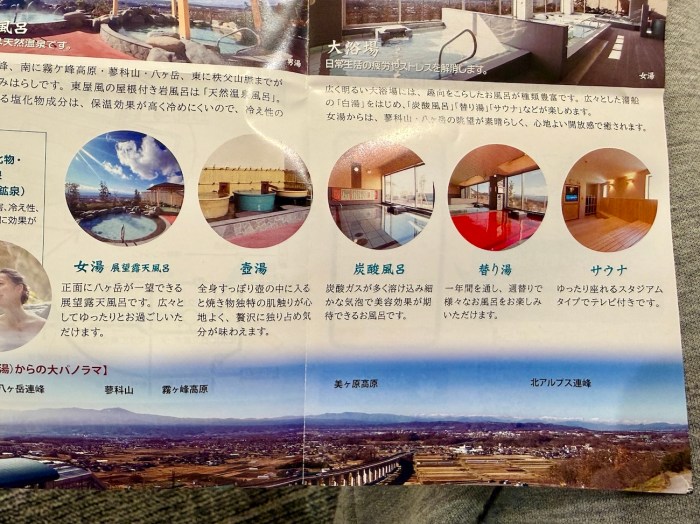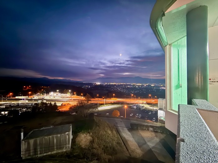 たどり着いたのは「みはらしの湯」なる温泉施設。高速PAから直結で温泉に入れるとは……名前のとおり眺望も期待できるらしく、昼間なら北アルプスまで見渡せるらしい。