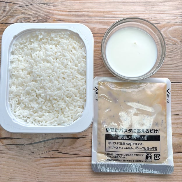 ② 深めの耐熱容器に①、カルボナーラソース、牛乳を入れてよく混ぜ、ラップをかけ流。600Wの電子レンジで2分し、温かくなったら、完成!