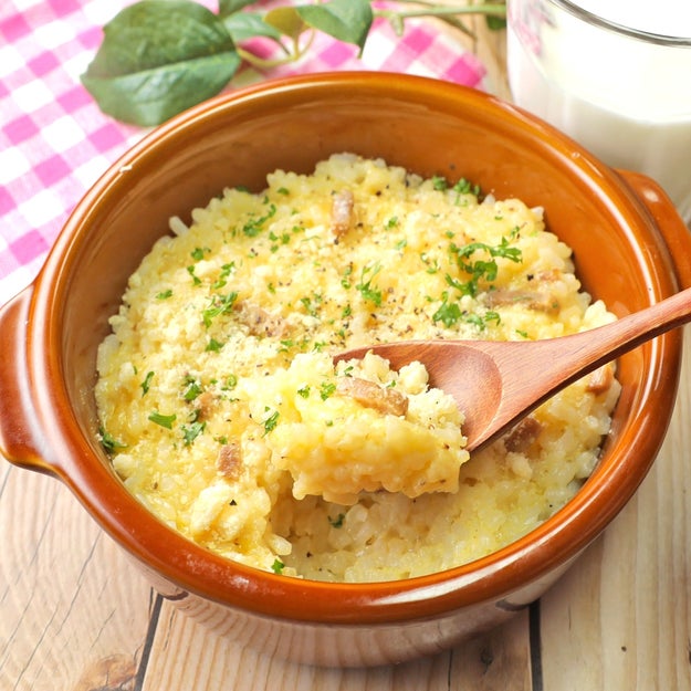 カルボナーラパスタソース、ごはん、牛乳の3つだけで作れる「カルボナーラリゾット」のレシピをご紹介します。混ぜてレンジでチンするだけなのでとっても簡単。忙しい日の夜ごはんや夜食で大活躍します。