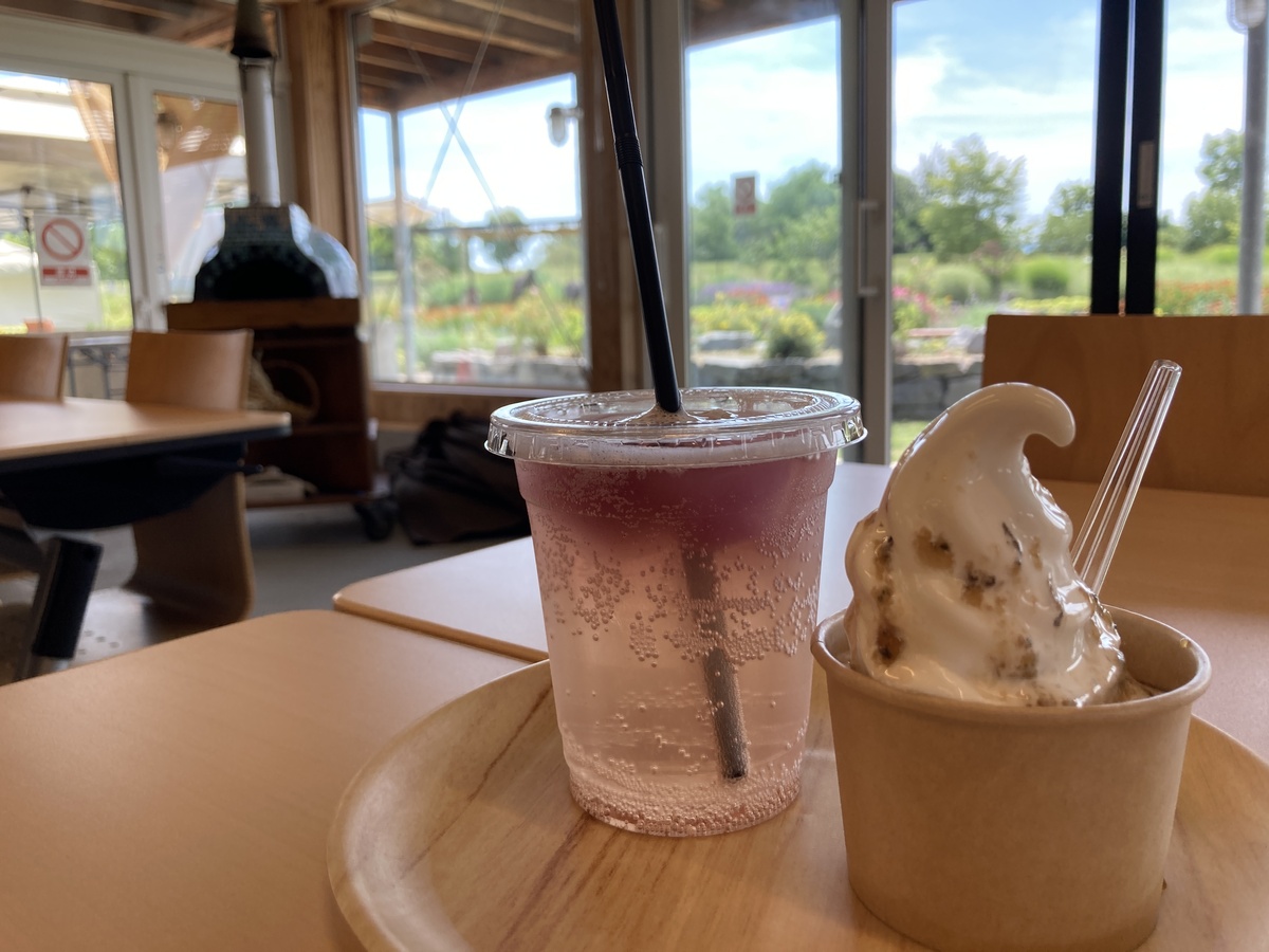 ソフトクリームやハーブティーなど、自然に囲まれて味わえる癒しメニューがそろっています。