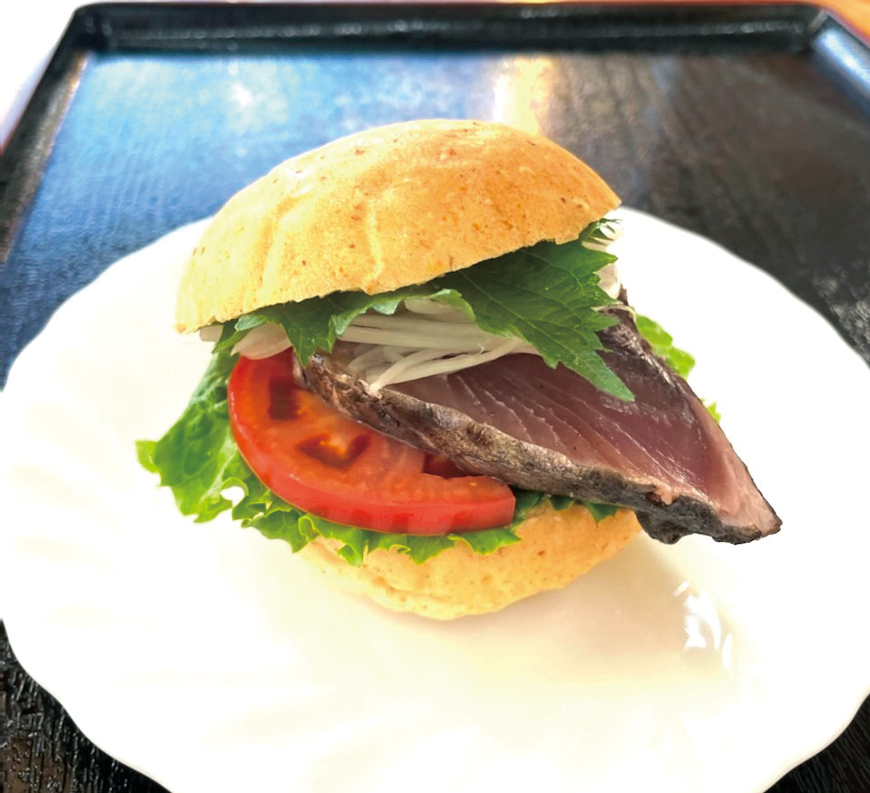 カツオ節を練り込んだバンズに、自家製タレに一晩漬けたカツオのタタキを挟んだ、カツオたたきバーガー 570円。