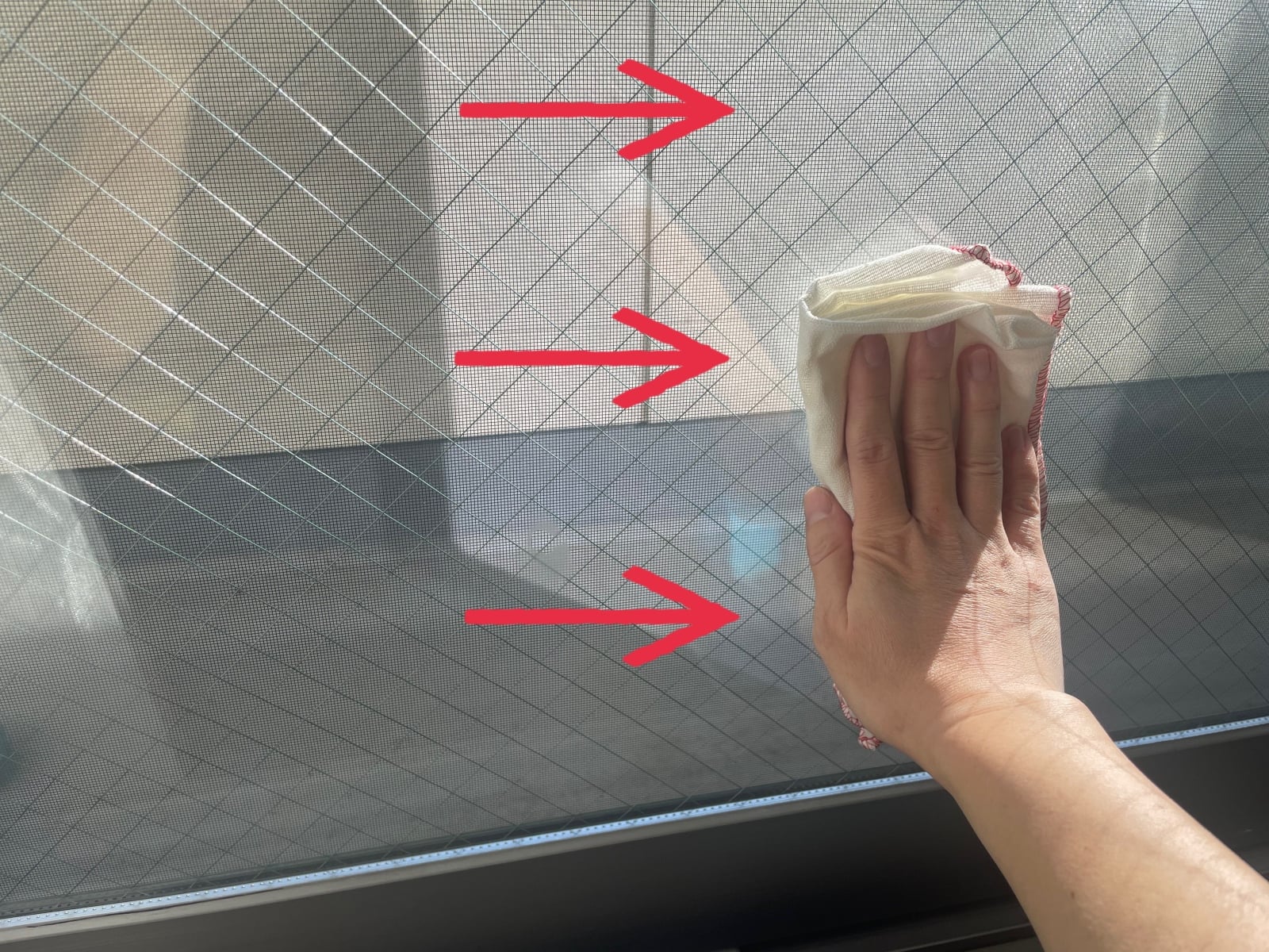 ゆるく絞ったクロスで拭いた後は、窓や網戸に水滴が残っています。汚れが固まっている部分があれば、水滴が残っているうちにこすりながら乾拭きして仕上げます。