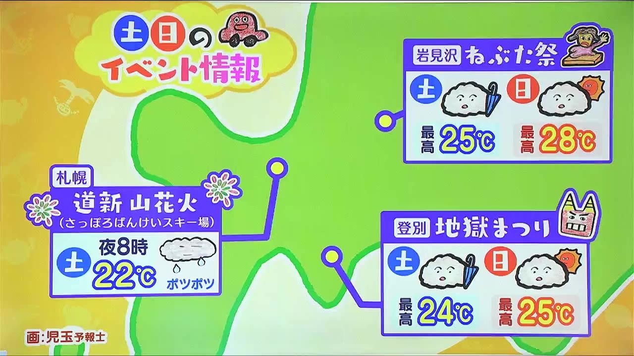 あす30日(土)夜は、ばんけいスキー場で花火大会です。山沿いではあす夜もポツポツと小雨が降るかもしれないので、念のためタオルや雨具をお持ちください。