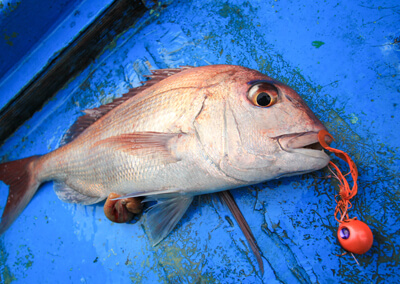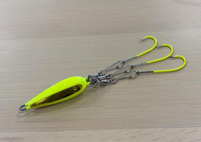 「その仕掛に、関東ではアルゼンチン赤エビやホヤを刺して、また中京ではイワシやサンマなんかをエサに釣るんだ。仕掛立てがシンプルなので、なかにはメタルジグにエサを付けて楽しむ釣り人もいるよ」