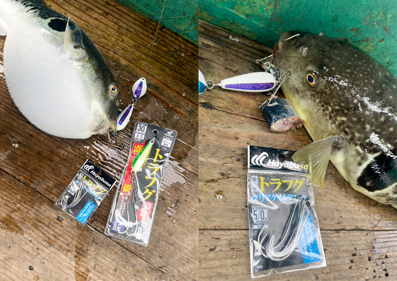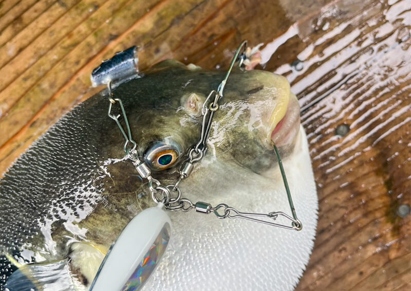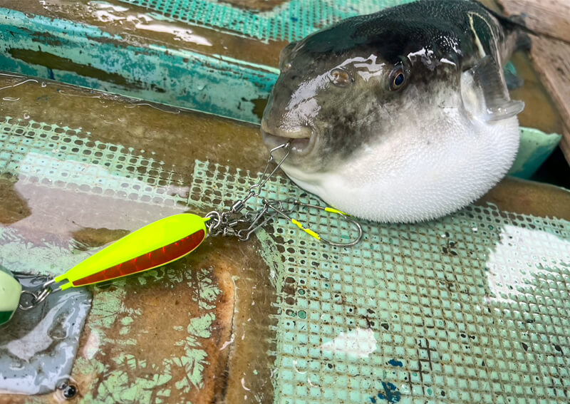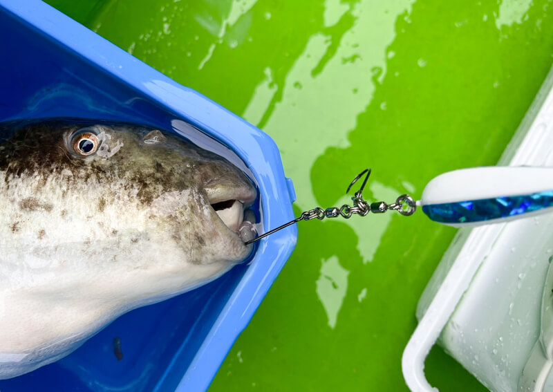 「そう、釣り方自体はシンプルなんだ。ただやっぱり、『いつアワセるのか?』が難しいところ…。アタリはトラフグ特有の金属的で強く大きな場合もあれば、モゾモゾ系のアタリ(フォール中に多い)、ついばむようなアタリ、急に仕掛を持って行くアタリなどがあって、アワセて掛けるのに苦労するね。でも、エサが付いていれば、もし一度アワセて掛からなくても追い食いをしてくれる魚なので、そのまま回収せずに誘いを入れると、またアタルことも多いよ。