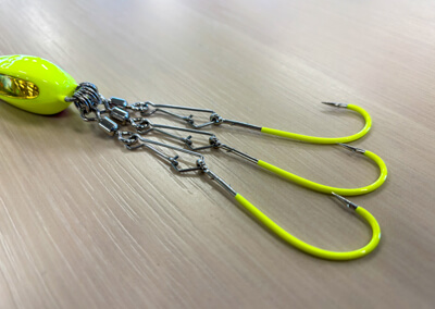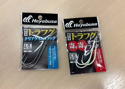 「次に仕掛とエサだけど、仕掛は“大型のブラクリ“にアシストフックのようなハリが付いたもの。たったこれだけ。地域によってハリ数の制限はあるものの、タイラバのようなシンプルな仕掛立てなので、セットもかんたんだよね。あとは、トラフグの叩くような引きや噛む力の強さから、使い続けるとハリが曲がったりハリ先が鈍ることが多いので、替えバリを準備しておくくらいかな」