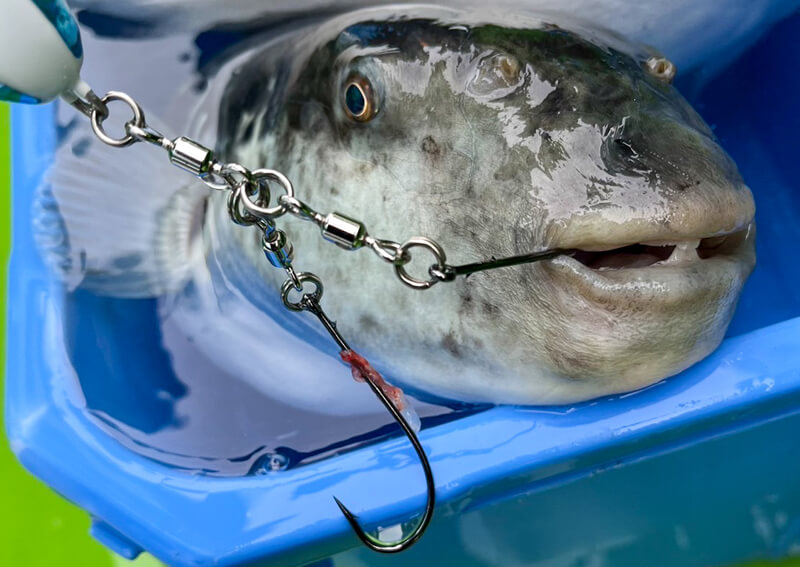 従来のカットウ釣りと違い、エサバリで食わせる釣り。フグは体格に見合わないおちょぼ口ながら、しっかりとハリに食いついてくれる