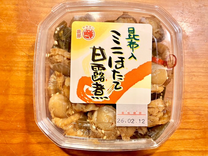 対して「昆布入 ミニほたて甘露煮」は辛さがほとんどなく、甘じょっぱい味を楽しめた。