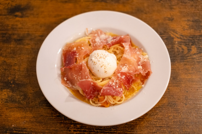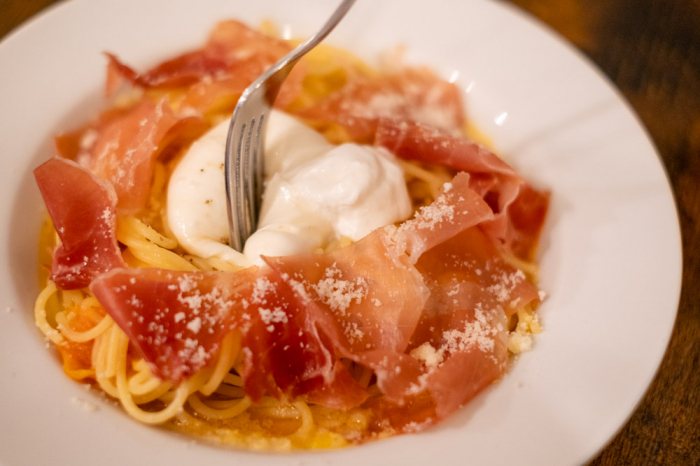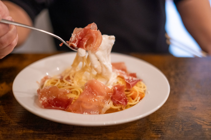 最後にいただいたのは、たっぷりと散りばめられた生ハムが目を引く「フレッシュトマトとブッラータチーズのオイルパスタ」。