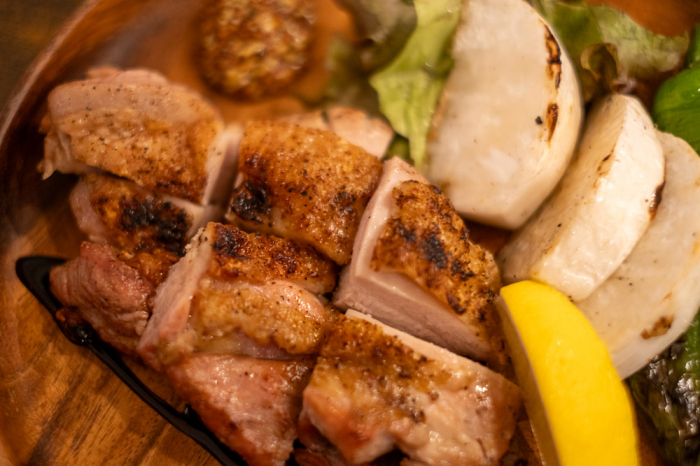 続いて、お店の代名詞である炭焼き料理から「赤鶏」のもも肉をいただきました。