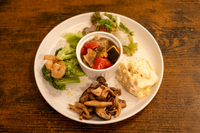 こちらは季節の野菜をふんだんに使用した「前菜の盛り合わせ」。時期によって内容が変わり、今回は魚のカルパッチョ、ポテタマサラダ、きのこのマリネ、えびとブロッコリーのアーリオオーリオ、カポナータでした。
