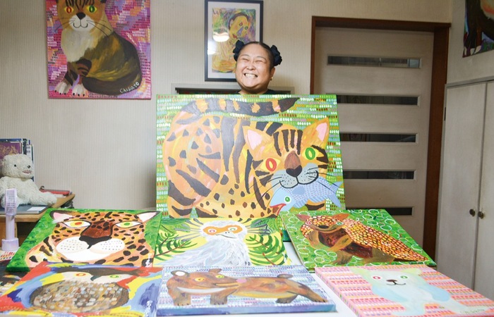 滝さんが絵を描き始めたのは10年ほど前。自閉スペクトラム症と診断され、幼いころから学校や職場での対人コミュニケーションに苦しみ、内に閉じこもりがちな性格だったが、県内の絵画教室に通い出したことをきっかけに創作意欲に火が付いた。「声に出すことが苦手で人としゃべらなかったが、絵を描き始めてから変わった」と滝さん。これまで都内の喫茶店で小規模な個展を2度開き、自身の作品を通じて来場者に元気や癒しを与えてきた。