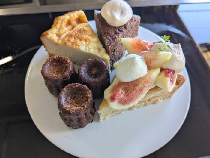 今回は定番の「白カビのチーズケーキ」と「オーガニックチョコケーキ」、「季節のタルト(いちじく)」「カヌレ(チョコ)」をテイクアウトさせていただきました。