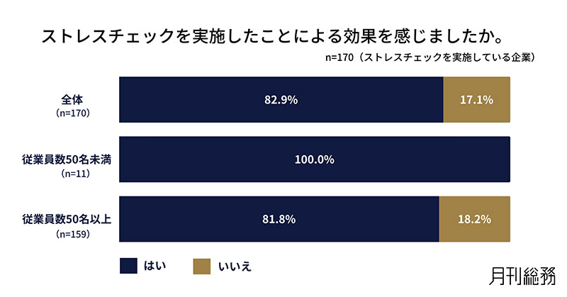 ストレスチェックを実施したことによる効果を感じたか尋ねたところ、8割以上が「効果を感じた」と回答した。まだ義務化されていない中で実施している従業員数50人未満の企業の方は、全員が「効果を感じた」と回答した(n=170/ストレスチェックを実施している企業)。
