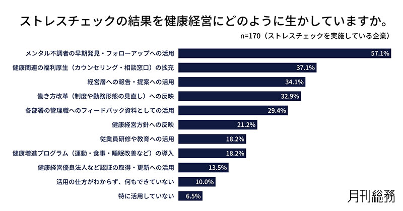 ストレスチェックの結果を健康経営にどのように生かしているか尋ねたところ、「メンタル不調者の早期発見・フォローアップへの活用」が57.1%で最多となった(n=170/ストレスチェックを実施している企業)。