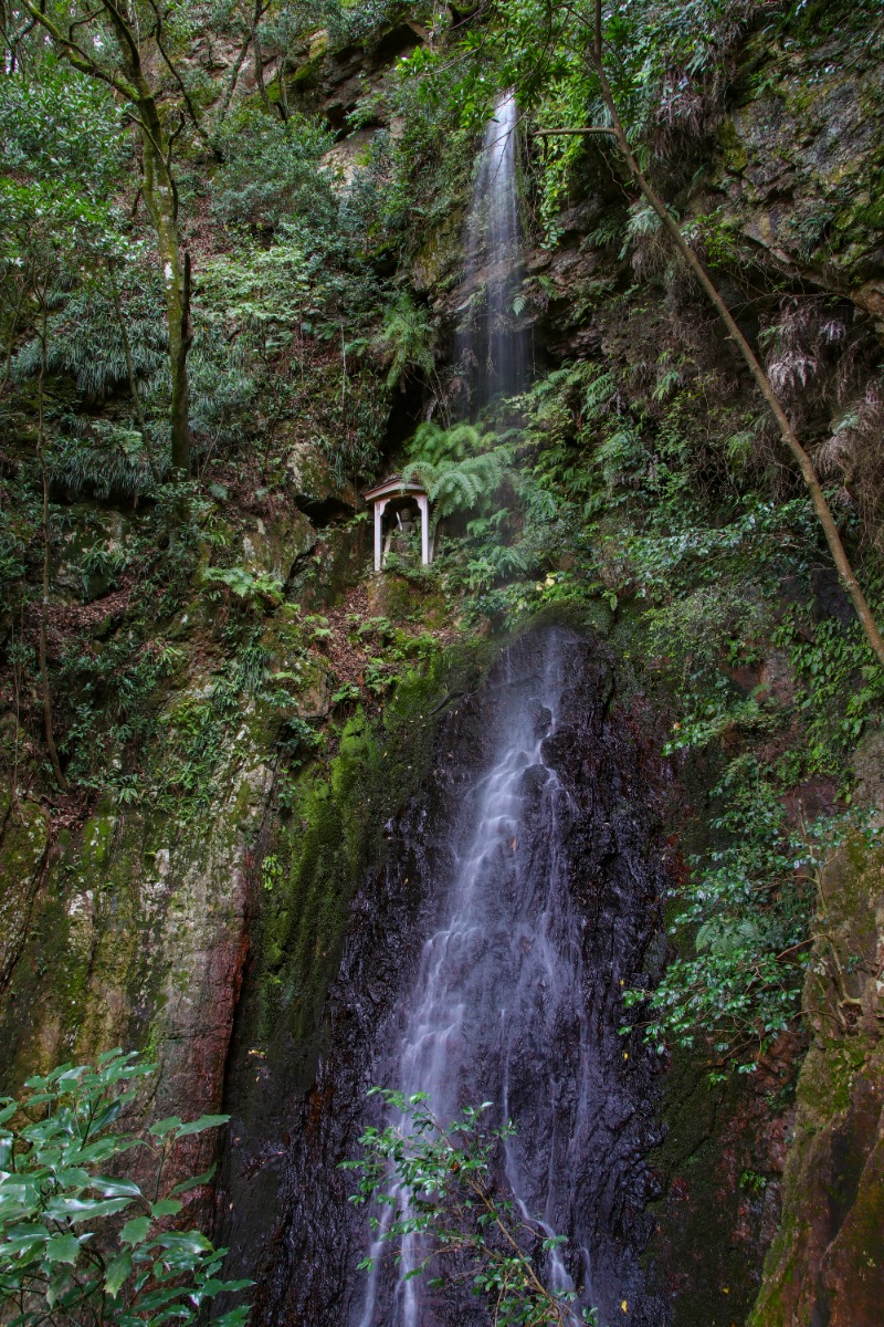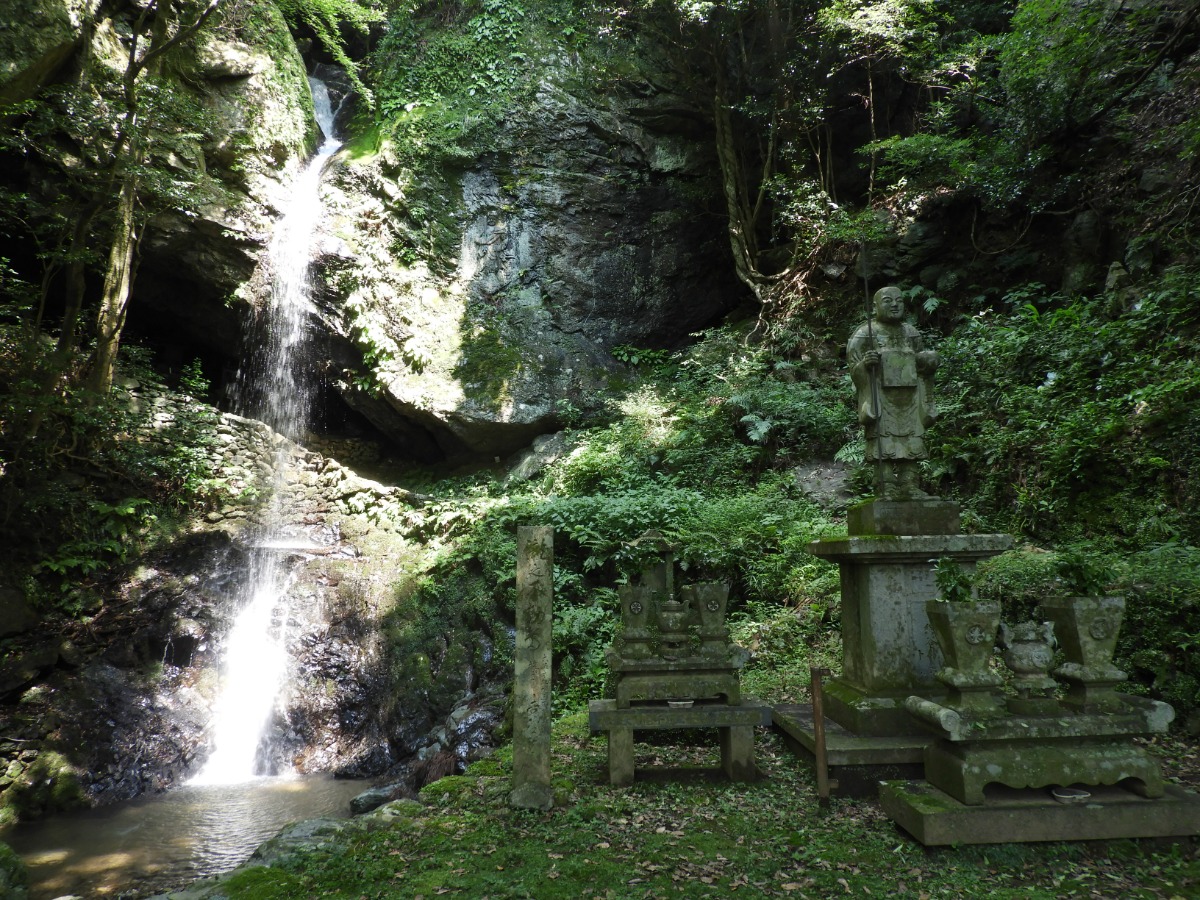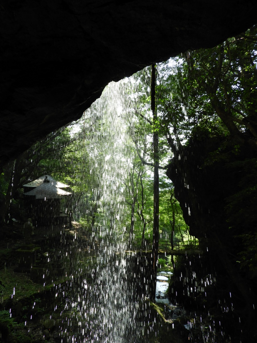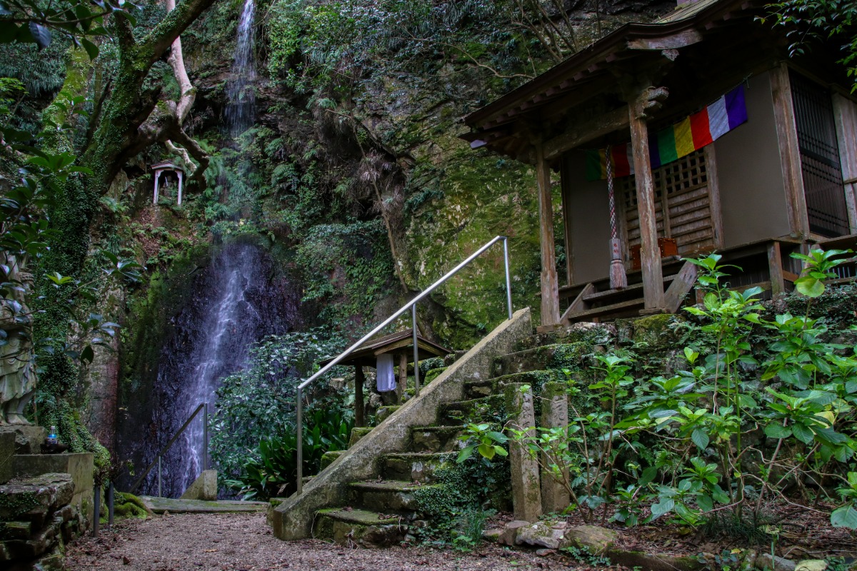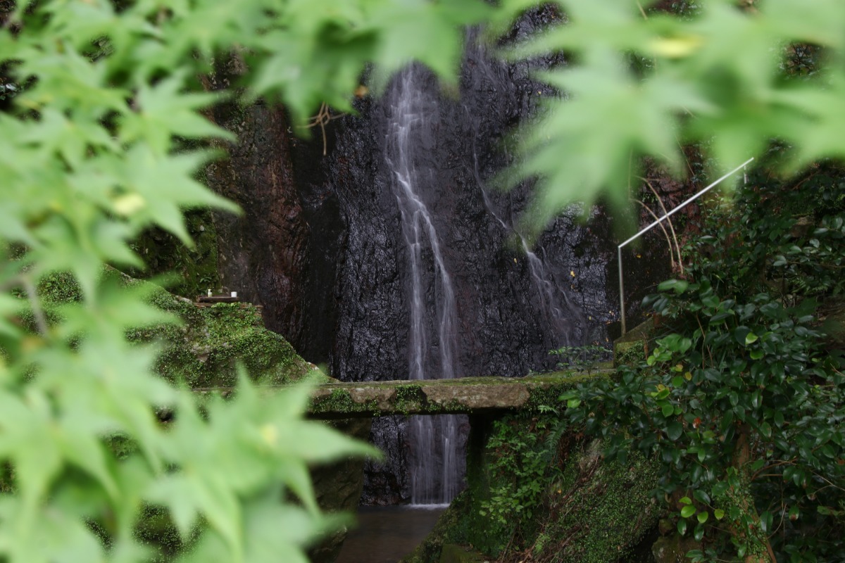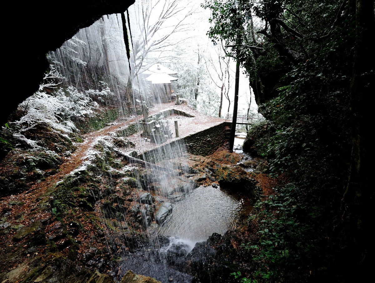 [星谷寺(しょうこくじ)]にある[不動の滝]。頭上から落下する滝水を裏側から眺めることができることから、[裏見の滝]とも言われている。境内を透かし見られ、神秘的かつ厳かな雰囲気。小道を抜けた先にはその昔、人々に禍をなしていた悪星を空海(弘法大使)が法力で地上に引きおろし、封じ込めたとされる星の岩屋へと続く。