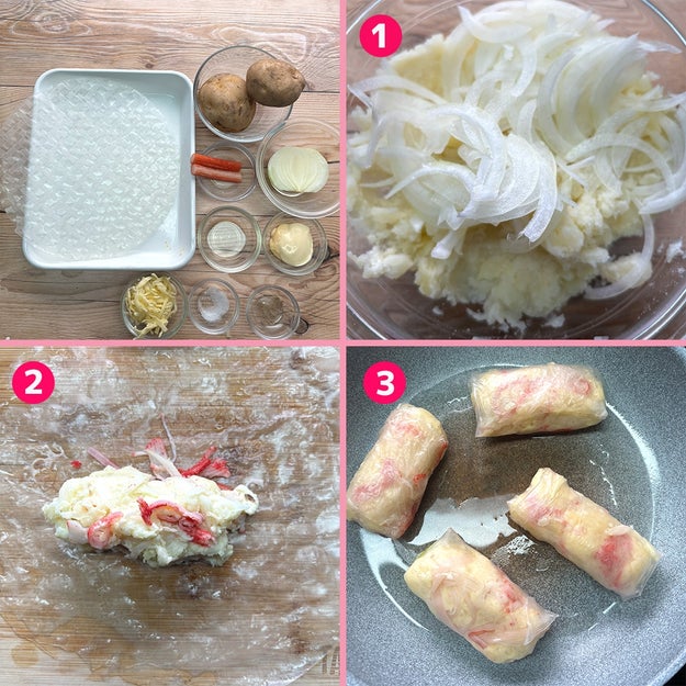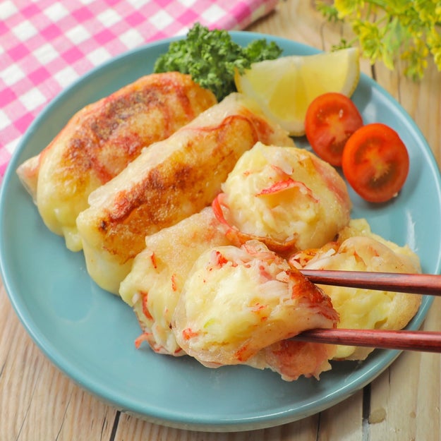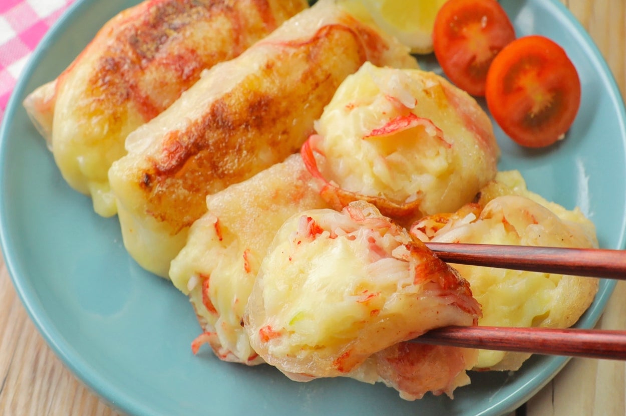 レンチンしたじゃがいもに、チーズとカニカマ、マヨをざっくり混ぜてライスペーパーで包むだけ!