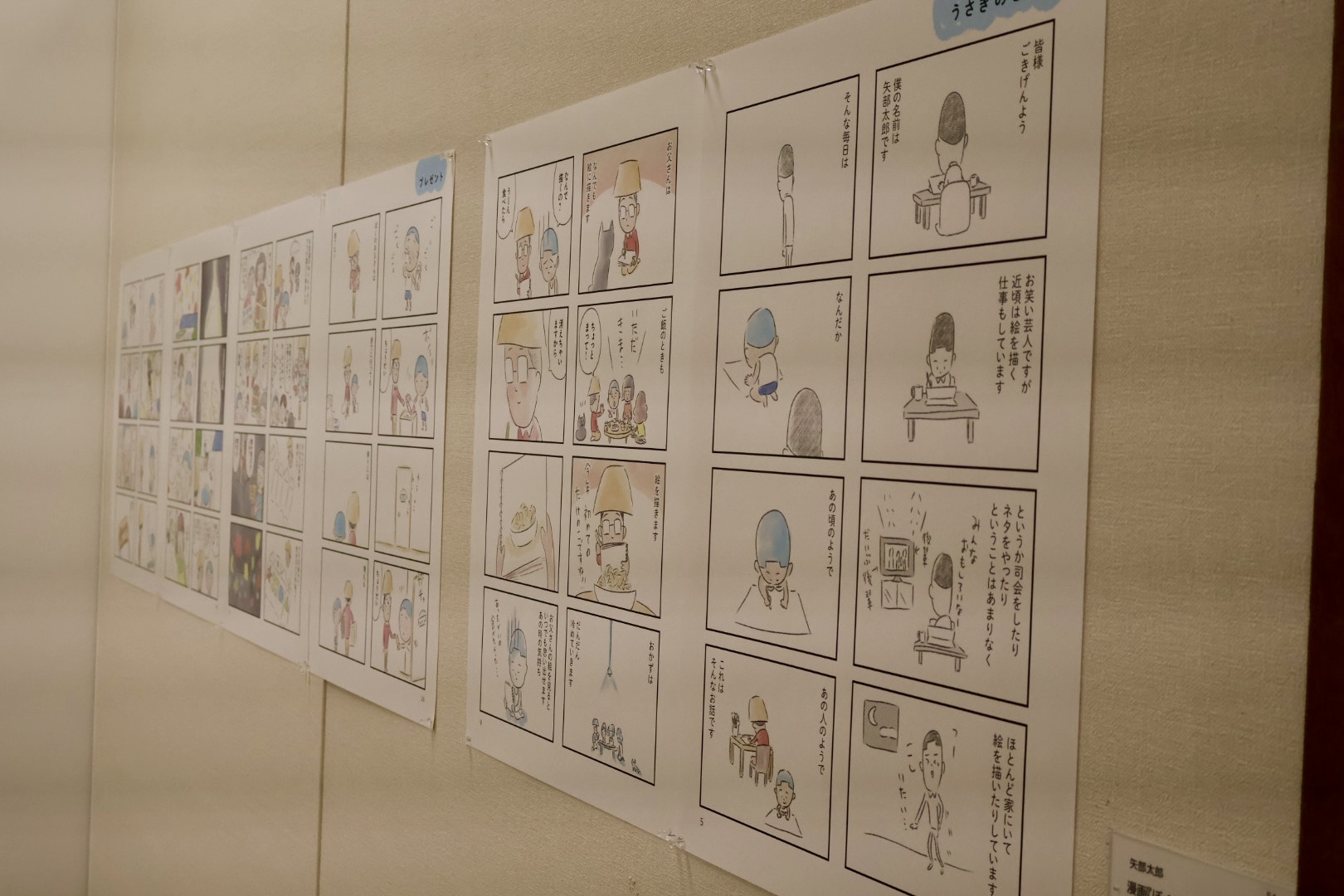 会場入口でまず目に入るのは、矢部太郎さんの著書『ぼくのお父さん』(新潮社)の表紙を使った特大パネル。今回の展覧会ポスターにもなっている印象的なビジュアルです。