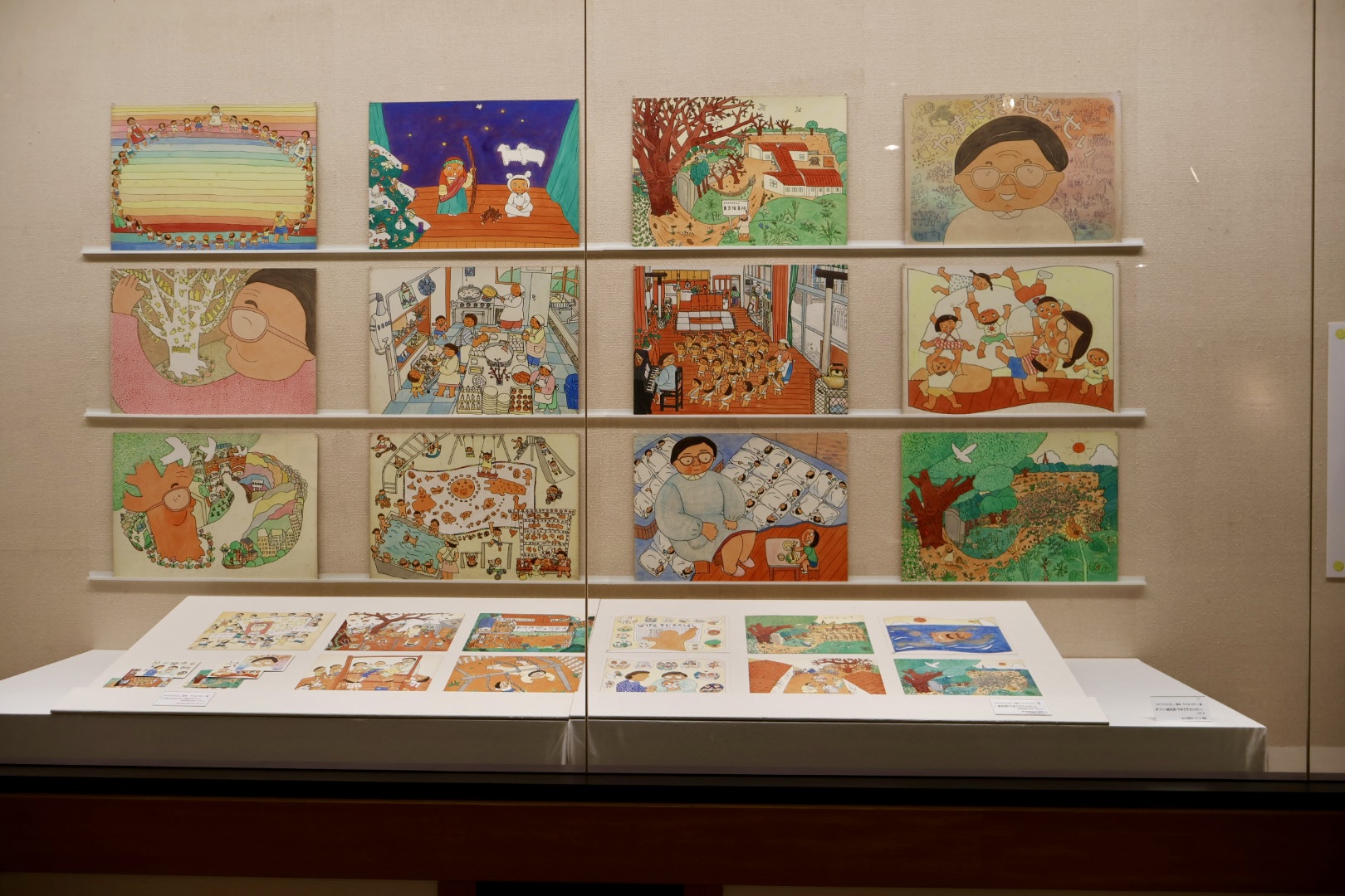 やわらかくカラフルな色使いの絵本や紙芝居の原画から、細部までていねいに描き込まれた作品まで、その一つ一つに深い愛情が感じられます。