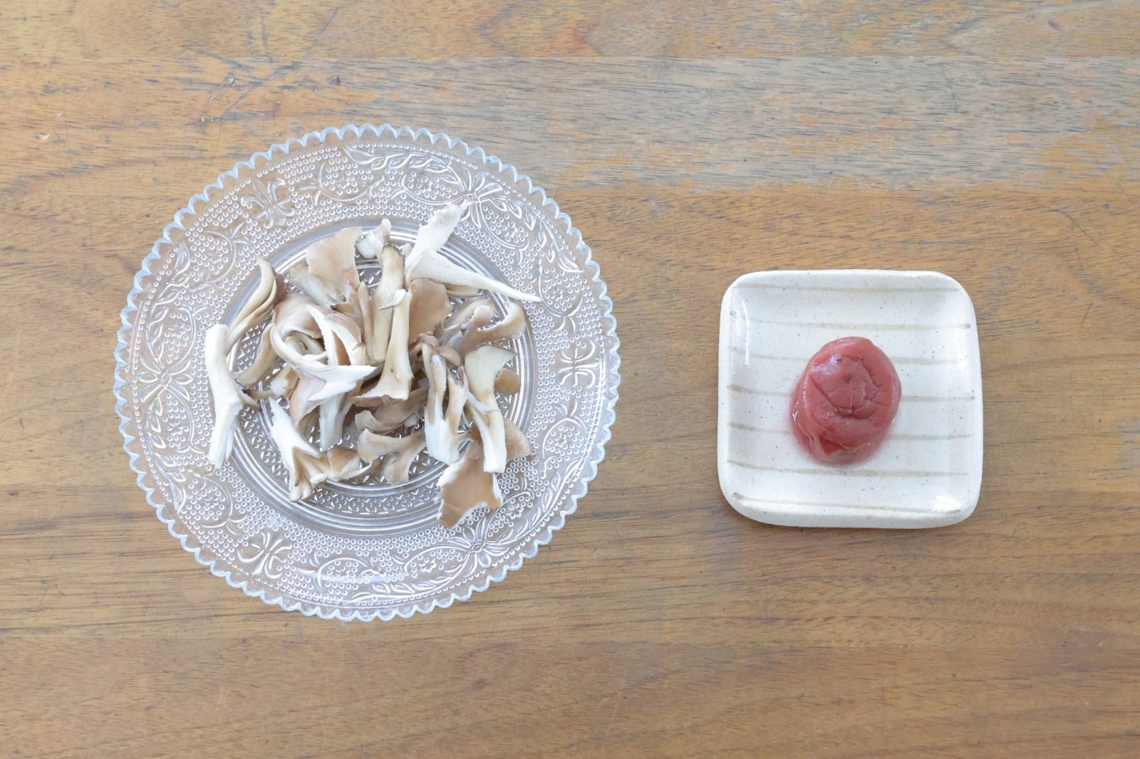 梅干しは種を取り除いてほぐし、まいたけは小さくさきます。