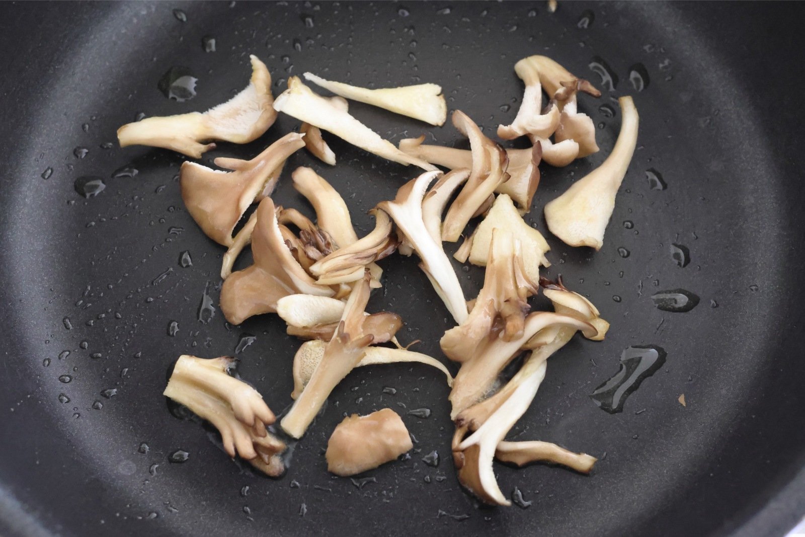1.フライパンにオリーブオイルをひき、まいたけを炒めます。しんなりしてきたら塩こしょうをふります。