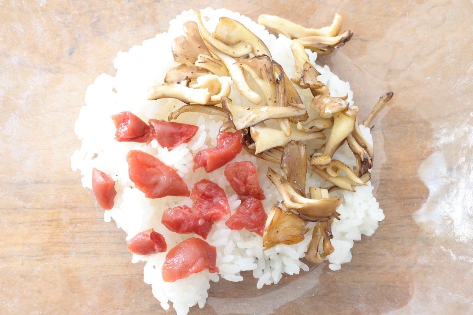 2.ごはんに、梅、まいたけを混ぜ合わせます。