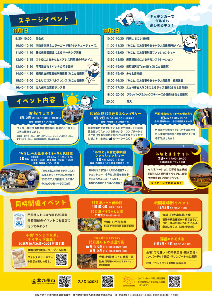 イベント名:北九州港開港記念イベント2025日程:2025年11月1日(土)・2日(日)会場:門司港・西海岸エリア(関門海峡ミュージアム周辺)入場料:無料(一部参加型イベントあり)主な見どころ:帆船「海王丸」寄港/ウォーキング×ウイスキー/花火フィナーレ/ゆるキャラ人気投票北九州市公式HP : 今年も、北九州港開港記念イベントを開催します!