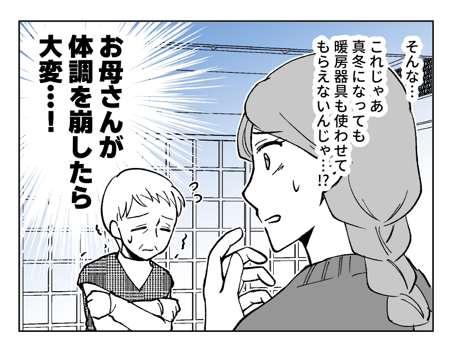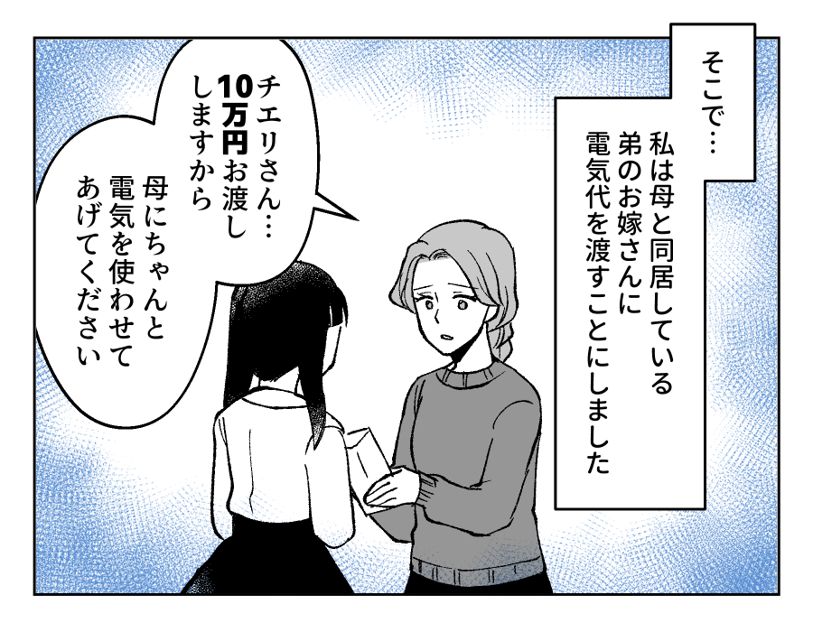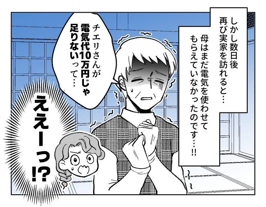 【編集部コメント】 確かに電気は大切に使いたいところですが、これはさすがに度を越しているような……。見かねたミユキさんが「母の電気代」としてチエリさんに10万円を渡したようですが、残念ながら状況は変わりません。はたしてミユキさんのお母さんは、無事快適に冬を越すことができるのでしょうか?