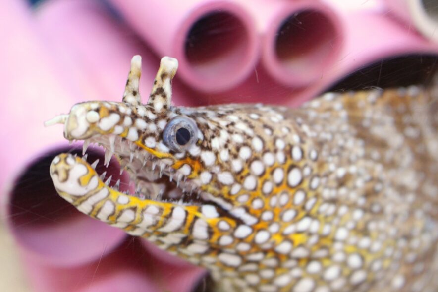 体には黒地に黄色っぽい斑点が広がっていて、それが“虎柄”のように見えるんです。見た目だけでなく、ウツボらしい鋭い歯と、洞穴からぬっと顔を出すスタイルも、どこか猛獣のよう。