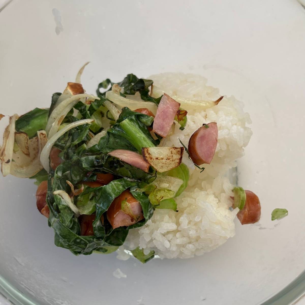JAグループ公式の「ソーセージと小松菜と玉ねぎの混ぜおにぎり♪」のレシピ