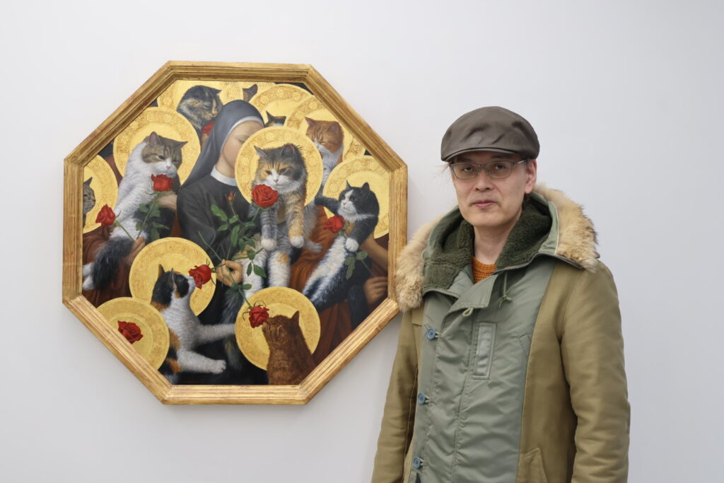 東京青山の骨董通りの小さなギャラリーに、ロシア、ベラルーシ、イタリアなどからの観光客が押し寄せたという画家・川井徳寛さんの個展「川井徳寛─猫礼賛祭壇画─」(2025年11月開催)。ギャラリーGYOKUEI(玉英)のオーナーの玉屋喜崇さんも、川井さんご自身も予想もしていない出来事だった。本展の作品は、初期ルネサンスの宗教画を彷彿させるが、絵画の主役が「猫」である。鑑賞者を不思議な世界に誘う川井さんがたどり着いた独自の油性テンペラ技法の開発や作品への思いなどをお聞きした。