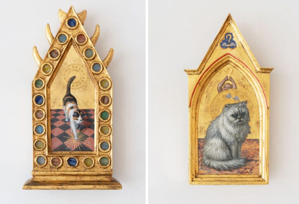 自分の描きたい絵に到達するため、卵黄に水や酢を加える割合、さらに油彩や水彩素材を組み合わせ分析、実験を繰り返し、独自の油性テンペラ技法に辿り着いたのです。そして今回は、描く対象を「猫」にしました。「猫」は単なる愛玩動物としてではなく、初期ルネサンス絵画をモチーフに重ね合わせたのが、「猫礼賛祭壇画」シリーズです。
