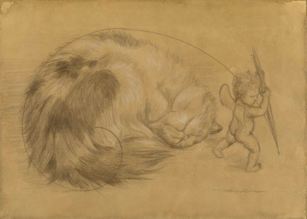 今回、海外のしかもロシアやベラルーシなどの観光客が、インスタをみて画廊を訪れるという予想だにしないことが起きました。彼らは、ロシア正教のイコンや宗教画を教会で目にする機会も多く、そこに「猫」が描かれていることに興味をもったのでしょう。猫を抱く聖女から、平和の祈りを感じたのかもしれません。これまでも、明確に平和をコンセプトにした《人類の友》というタイトルの作品を描きました。それは、数学者で、教員だった父の影響で、構造や論理を読み解くことが自然と身に付きましたが、あわせて父は戦争体験をしたこともあり、平和を愛して、戦いを憎む精神を教えられました。両親と行った教会での体験も私の中の一部になっていると思います。