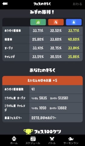 フェス終了後はスマホアプリ「Nintendo Switch Online」の「イカリング3」で自分の詳細な記録を見ることができます。