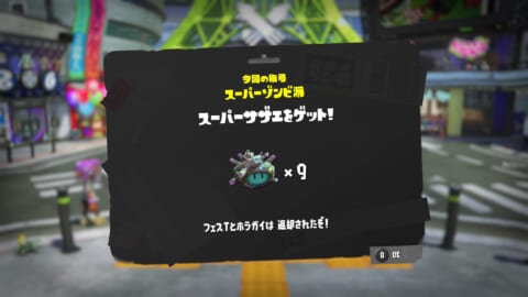フェス終了後最初にスプラトゥーン3を起動するとフェスの結果のニュースが流れます。ニュースを聞き終わった後広場に入ると自動的にフェスTが返却され、自分のフェスポイントによる称号と所属勢力の順位により決まった個数のスーパーサザエがもらえます。
