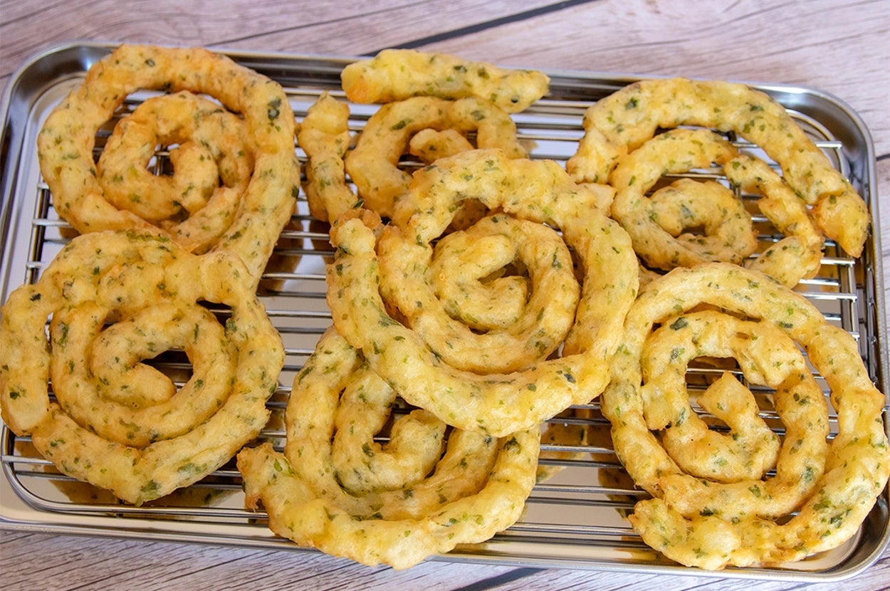じゃがいもをつぶして絞り袋に入れ、くるくると成形してこんがり揚げた「くるくる青のりチーズポテト」。