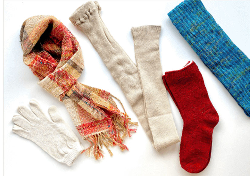 草木染めの手織り絹で作ったストールや靴下、ボディタオルなど。どれも一点もの。