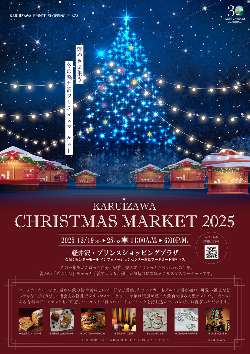 2025年12月19日(金)から12月25日(木)まで、長野県・軽沢町の「軽井沢・プリンスショッピングプラザ」にて『KARUIZAWA CHRISTMAS MARKET2025(軽井沢クリスマスマーケット2025)』が開催。施設内のセンターモール インフォメーションセンター前とフードコート前テラスに、1週間で合計約60店が出店。