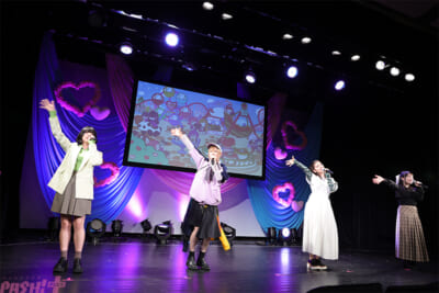 続いてオープニング映像とともにキャスト陣がステージ上に登場すると、MCの青木佑磨さんによる進行で早速アフレコ時のエピソードを振り返った。第1期で出来上がったアフレコ現場の空気感の中に途中から参加した時の印象については「とても入りやすかった」とのことで、高橋さんは「転校生ではなく、違うクラスだった子と進級して同じクラスになれたような感覚」と表現し、現場の和気あいあいとした雰囲気が伝わるやり取りを見せてくれた。