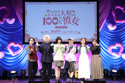 TVアニメ『君のことが大大大大大好きな 100 人の彼女』スペシャルイベント~ありがと、大好きになってくれて~のオフィシャルレポートが到着! イベントには加藤渉さん(愛城恋太郎役)、進藤あまねさん(原賀胡桃役)、高橋李依さん(須藤育役)、Lynnさん(美杉美々美役)、高尾奏音さん(華暮愛々役)が登壇しました。