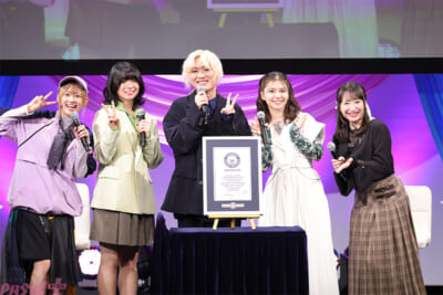 イベントも後半に入り、いよいよ恋太郎の“愛の演説”通常速度&ノーカット ver.の世界初上映へ。“愛の演説”は第2期最終話に登場する名場面であり、恋太郎が彼女たち一人ひとりの「大好きなところ」を語り尽くす、まさに『100 カノ』を象徴するシーン。このセリフは「日本語アニメで最も長いセリフ(Longest monologue in a Japanese-language animation)」としてギネス世界記録に認定されており、壇上にはその認定証も登場。本編ではセリフの長さのあまり早回しでの放送となっていたが、今回がファン待望の“通常速度&ノーカット”での初お披露目の場となった。
