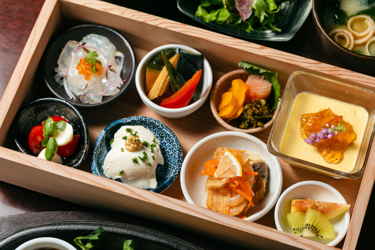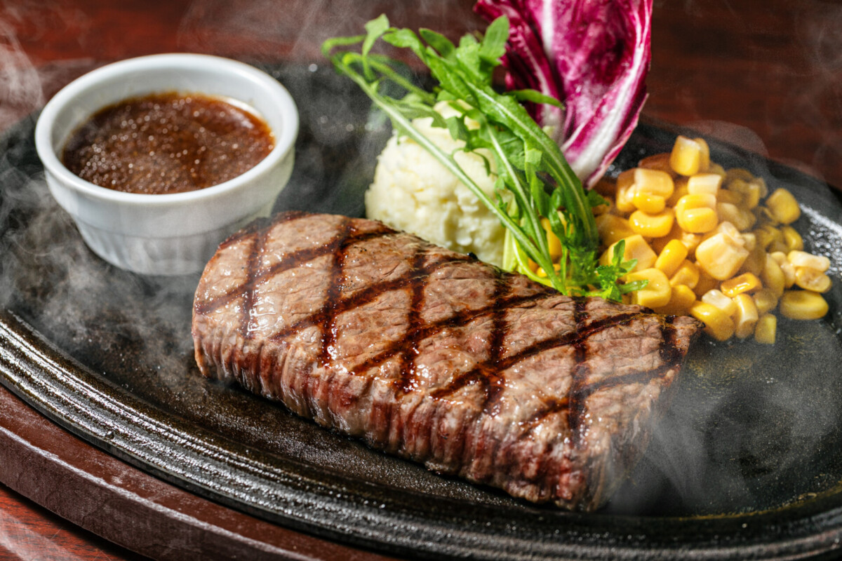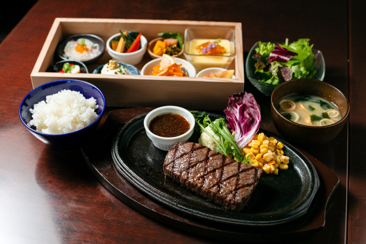 「ステーキバンケット」では、専用グリルで香ばしく焼き上げたハンバーグ・ステーキをはじめ、自家製の8種小鉢や羽釜でふっくら炊き上げた厳選ブランド米を使用したご飯を味わえます。