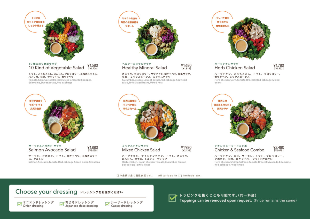 ハーブチキンやサーモンなどのメイントッピングから1品、トマト、アボカド、ミックスビーンズなどのサブトッピングから4品、計5品を自分好みにカスタマイズできます。