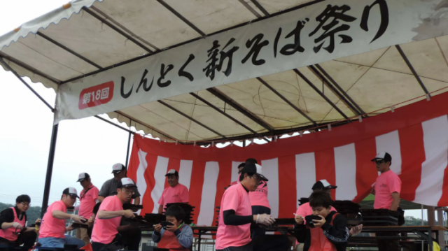 収穫したばかりのそばを「とれたて」、その場で「ひきたて」、職人が「うちたて」、そしてすぐに「ゆでたて」で提供する「4たてそば」が名物の『しんとく新そば祭り』。