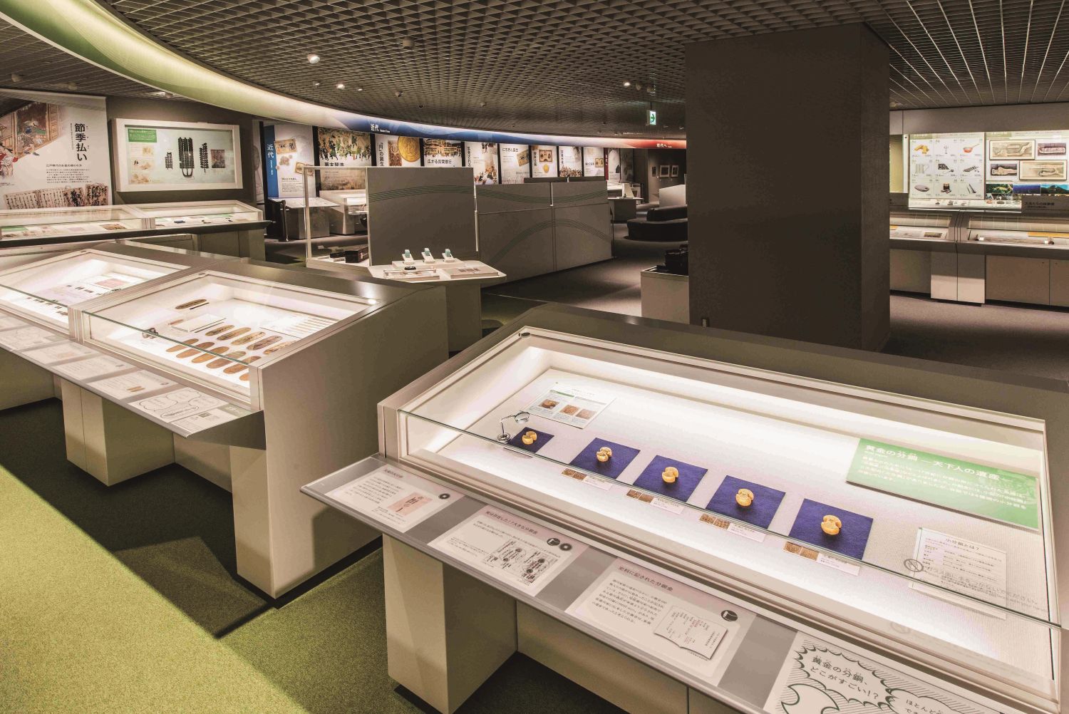 日本の貨幣の歴史や関連する資料などを展示。教科書で見たことのある和同開珎や天正大判などの実物を見たり、金貨の重さを体験できる。