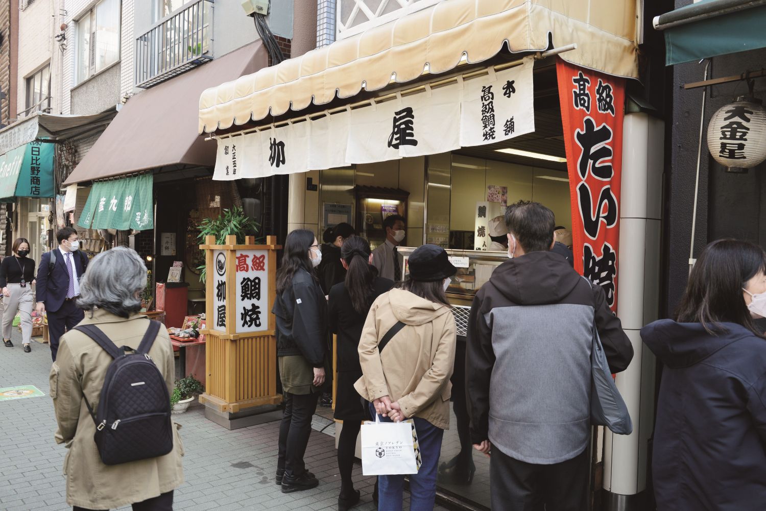 ここには老舗が多い。大正5年(1916)創業の『柳屋』はいつも行列ができる鯛焼き店。東京三大鯛焼きの一つともいわれ、一つずつ丁寧に焼かれる鯛焼きは「天然物」とも称されている。ほかにも、ジャンボがんもが名物の『とうふの双葉』、いなり寿司の『志乃多寿司總本店』、つづら製造の『岩井つづら店』などが点在している。