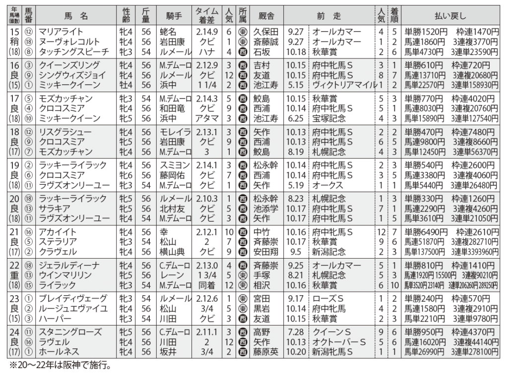 5・6歳馬で好走した3頭は前走で勝つか、前年のエリザベス女王杯で連対していた。