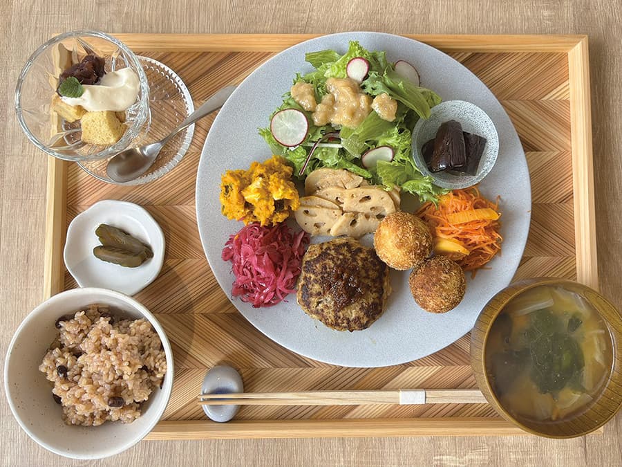 人気の『ひとつぶランチ』は無農薬で育った旬の野菜をたっぷりと味わえる、料理の品々を鮮やかに盛り付けたプレートがメイン。玉ねぎ麹を隠し味にしたお味噌汁、酵素玄米に奈良漬けが付く充実の内容で、2ヶ月ごとに料理の内容が替わり旬の食材を楽しめます。
