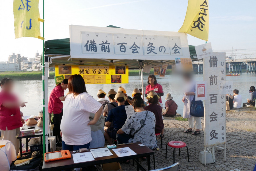 帽子のように陶器を頭に乗せた大人たち。その光景に少し驚き、立ち止まってしまいました。話を伺うと、備前焼で作られた専用のお皿を頭に乗せて、「百会」というツボにお灸をする備前百会灸の無料体験が行われていました。血行が良くなる、体が温まる、よく眠ることができるなど、疲労回復の効果があるとされています。